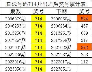 从上表统计不错看出,直选号码714开出之后,其下期奖号: