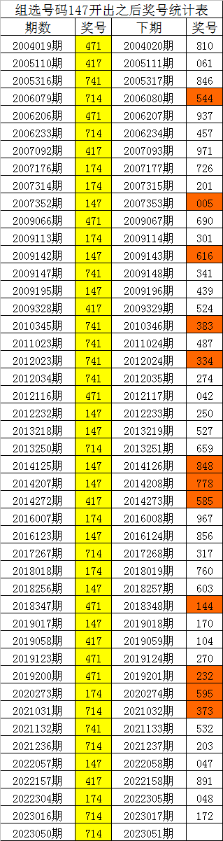从上表不错看出,组选号码147开出之后,出现次数最多的三个号码鉴识为:047,本期防这三码中落号;出现次数最少的三个号码鉴识为:986,本期瞻望这三个号码不会同期出现,本期杀一码:9。