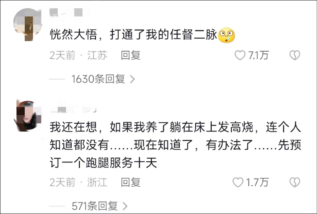 前段时刻,抖音用户“芒果加冰”发布的一段视频引起了不少东说念主的关注:视频中,这位网友一个东说念主在家发热生病,老公在外地回不来,于是费钱请了一位跑腿小哥上门护士我方。